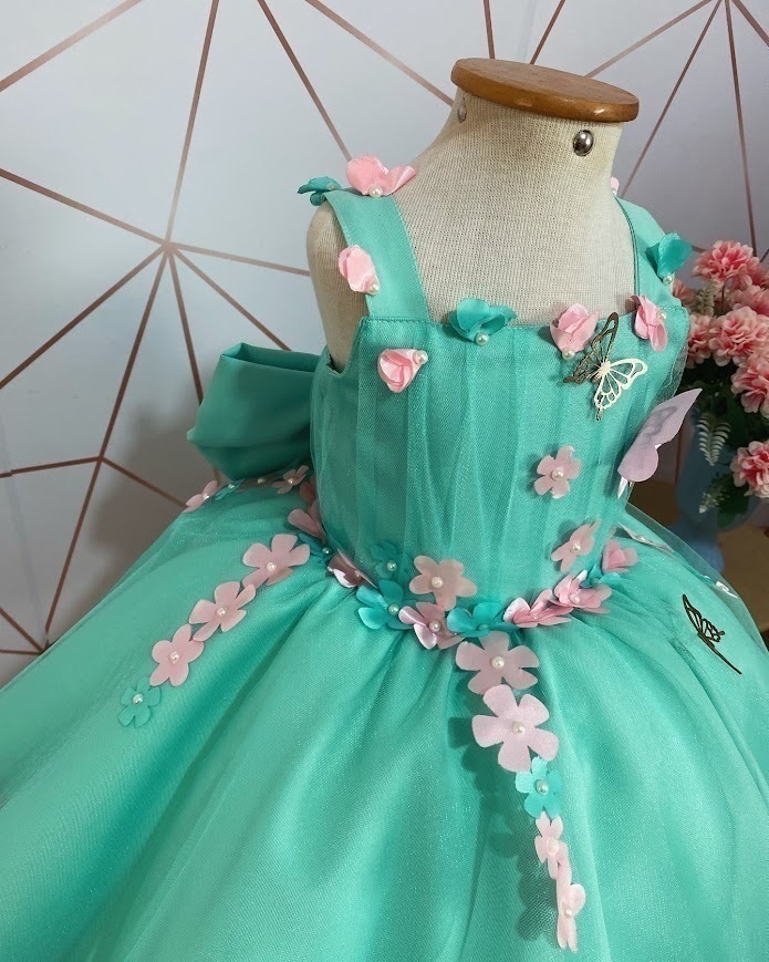 Desperte a magia com nosso vestido exclusivo, inspirado em um jardim encantado, confeccionado com flores em 3D, tecido em organza cristal e tule francês.